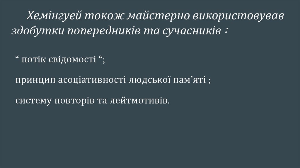 Хемінгуей токож майстерно використовувавздобутки попередників та сучасників :