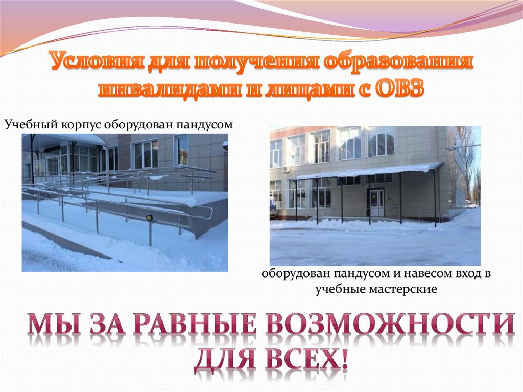 Учебный корпус оборудован пандусомоборудован пандусом и навесом вход в