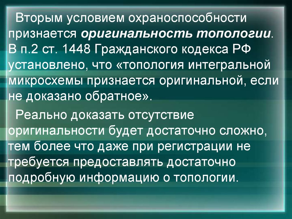 Вторым условием охраноспособностипризнается оригинальность топологии.