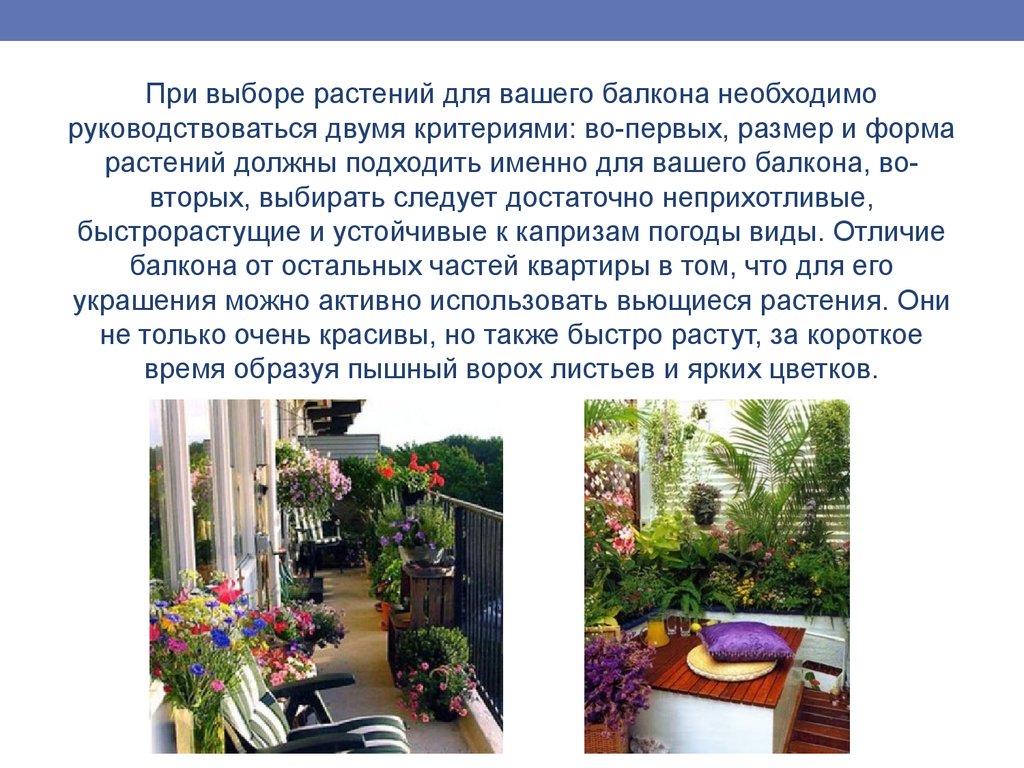 растений должны подходить именно для вашего балкона, вовторых, выбирать следует достаточно неприхотливые,