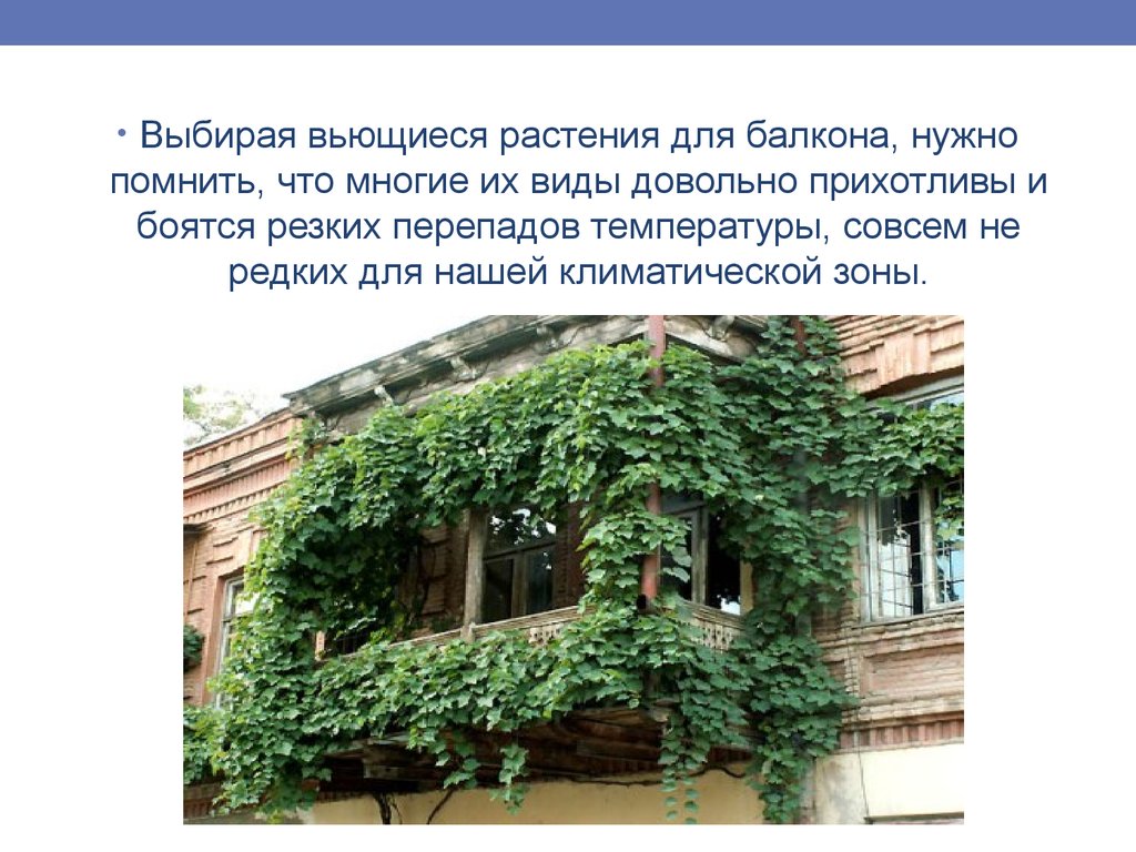 • Выбирая вьющиеся растения для балкона, нужнопомнить, что многие их виды довольно прихотливы и