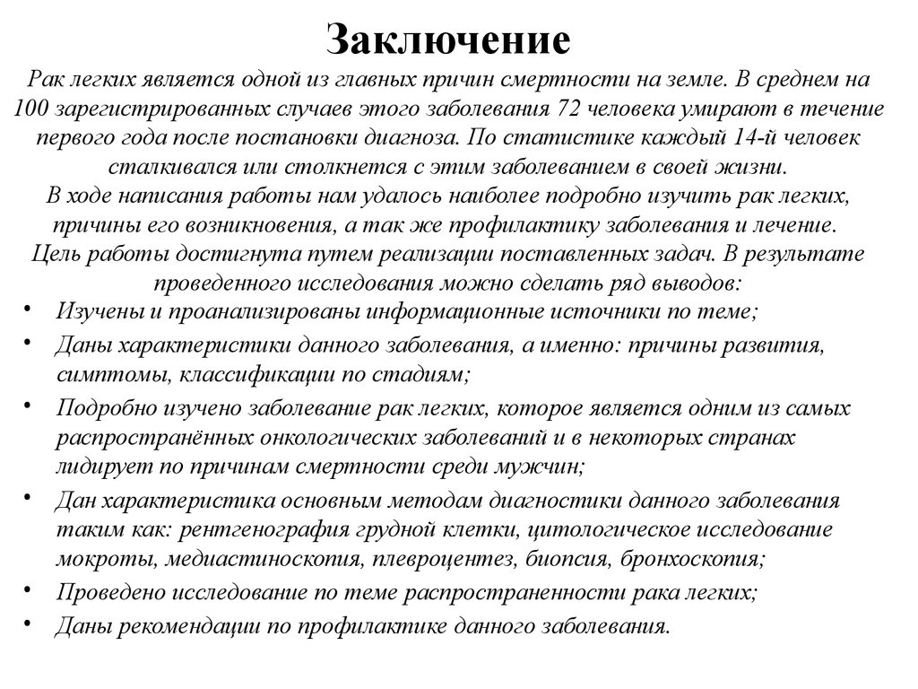 ЗаключениеРак легких является одной из главных причин смертности на земле. В среднем на