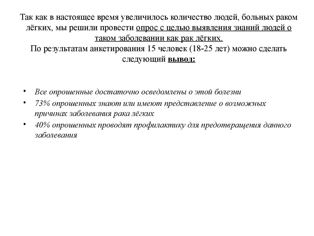 Так как в настоящее время увеличилось количество людей, больных ракомлёгких, мы решили провести опрос с целью выявления знаний людей о