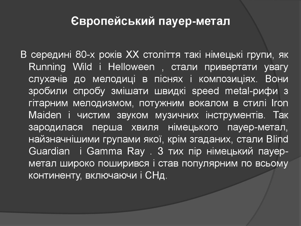 Європейський пауер-металВ середині 80-х років XX століття такі німецькі групи, як