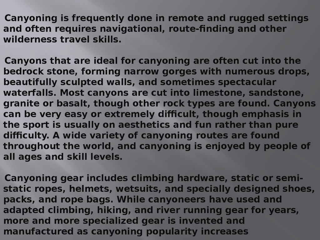Canyoning is frequently done in remote and rugged settingsand often requires navigational, route-finding and other