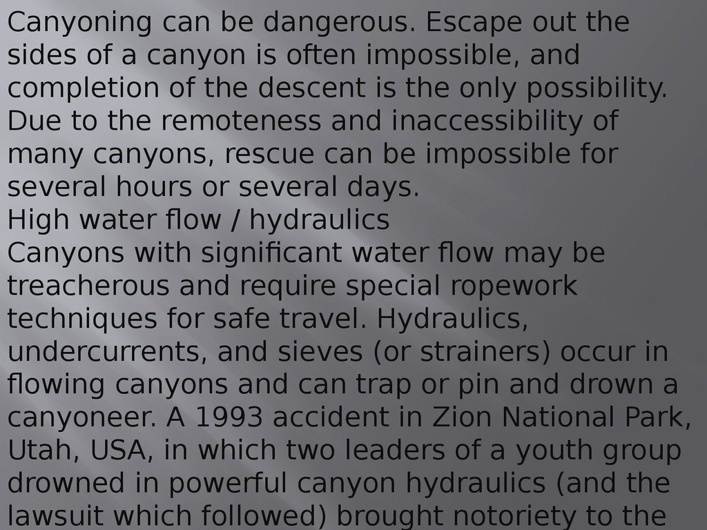 Canyoning can be dangerous. Escape out thesides of a canyon is often impossible, and