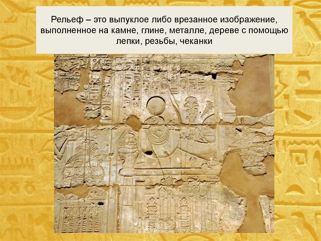 Рельеф – это выпуклое либо врезанное изображение,выполненное на камне, глине, металле, дереве с помощью