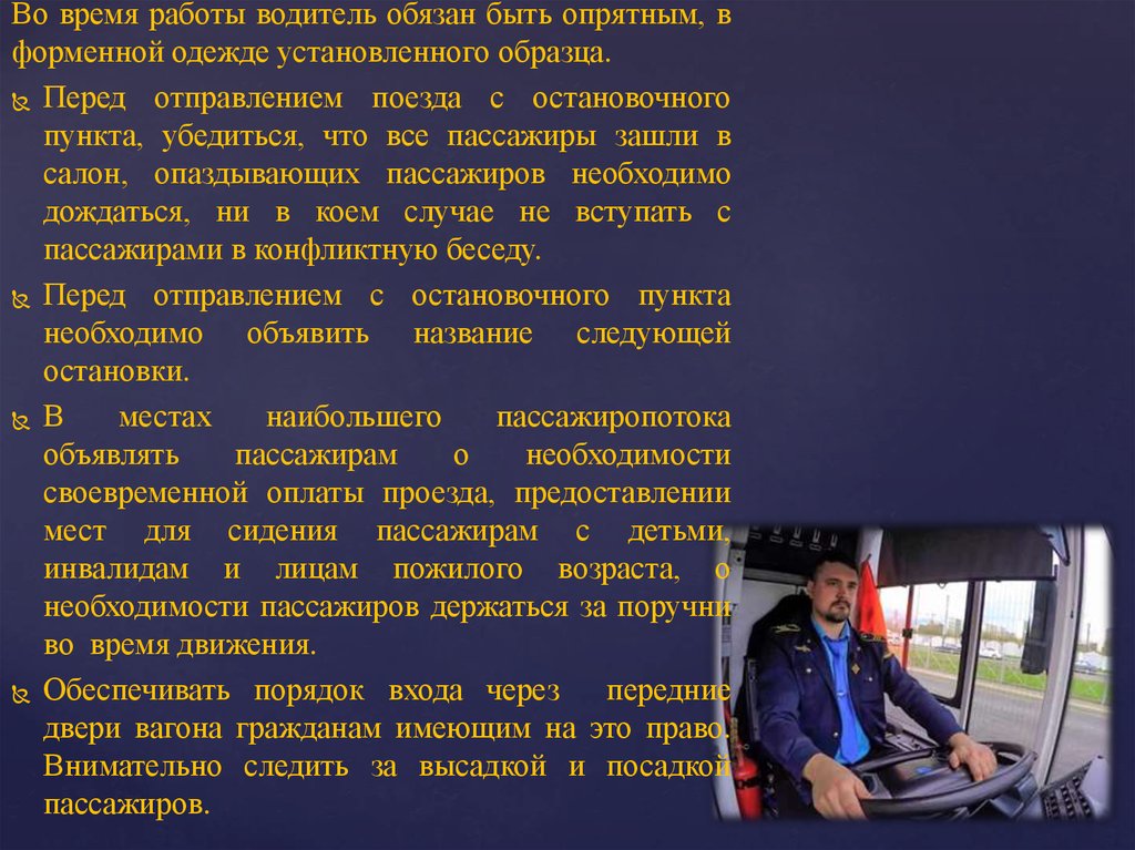 Во время работы водитель обязан быть опрятным, вформенной одежде установленного образца.