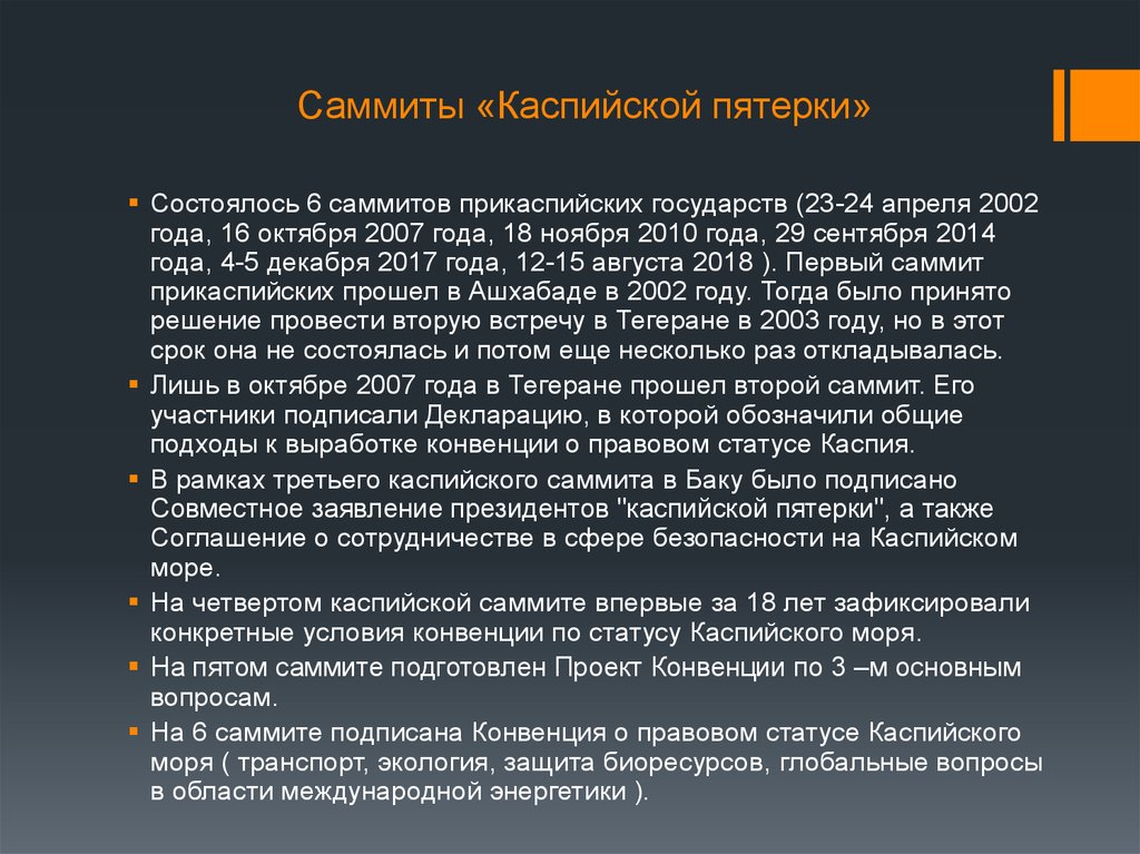 Саммиты «Каспийской пятерки»Состоялось 6 саммитов прикаспийских государств (23-24 апреля 2002
