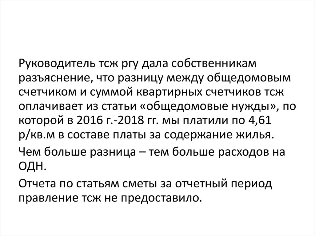 Руководитель тсж ргу дала собственникамразъяснение, что разницу между общедомовым