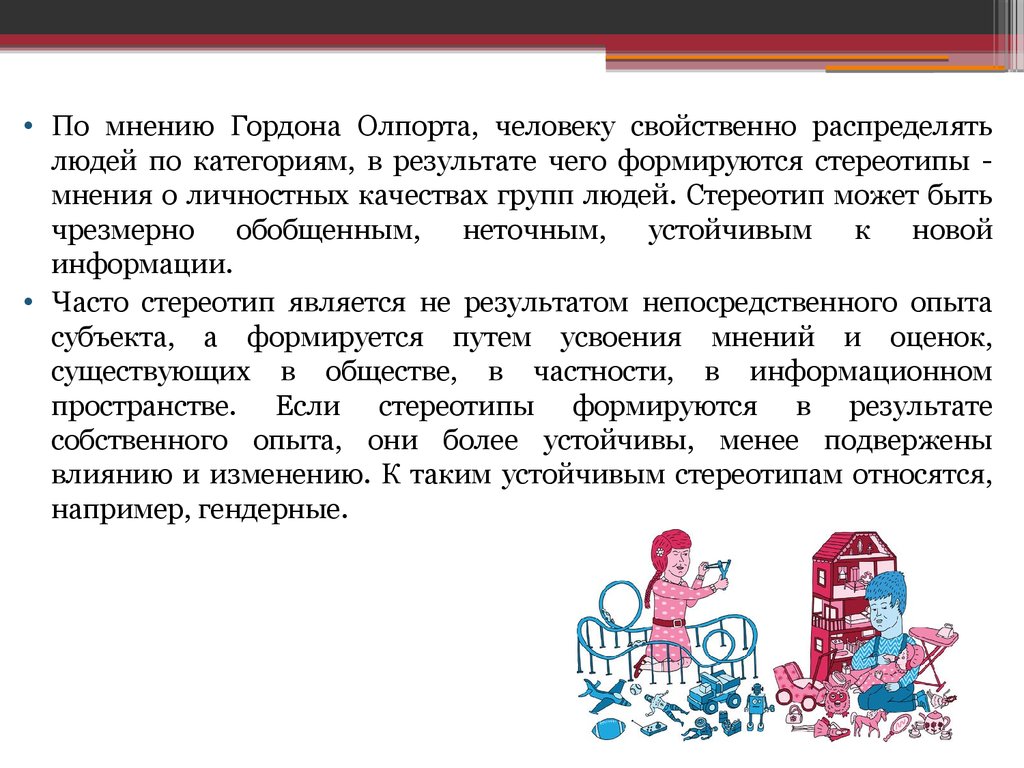 • По мнению Гордона Олпорта, человеку свойственно распределятьлюдей по категориям, в результате чего формируются стереотипы мнения о личностных качествах групп людей. Стереотип может быть