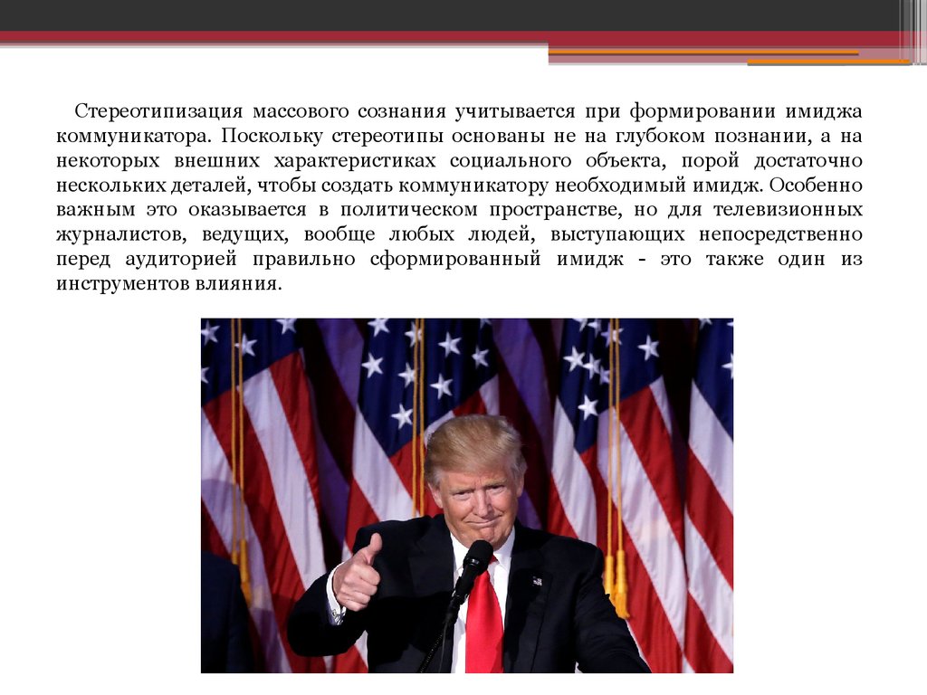 Стереотипизация массового сознания учитывается при формировании имиджакоммуникатора. Поскольку стереотипы основаны не на глубоком познании, а на