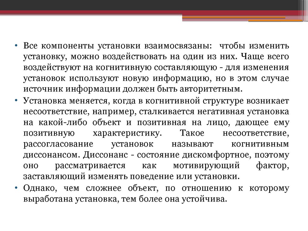 • Установка меняется, когда в когнитивной структуре возникает