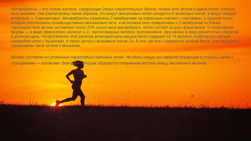 Миофибриллы —это тонкие волокна, содержащие 2вида сократительных белков: тонкие нити актина и вдвое более толстыенити миозина. Они расположены таким образом, что вокруг миозиновых нитей находится 6 актиновых нитей, в вокруг каждой