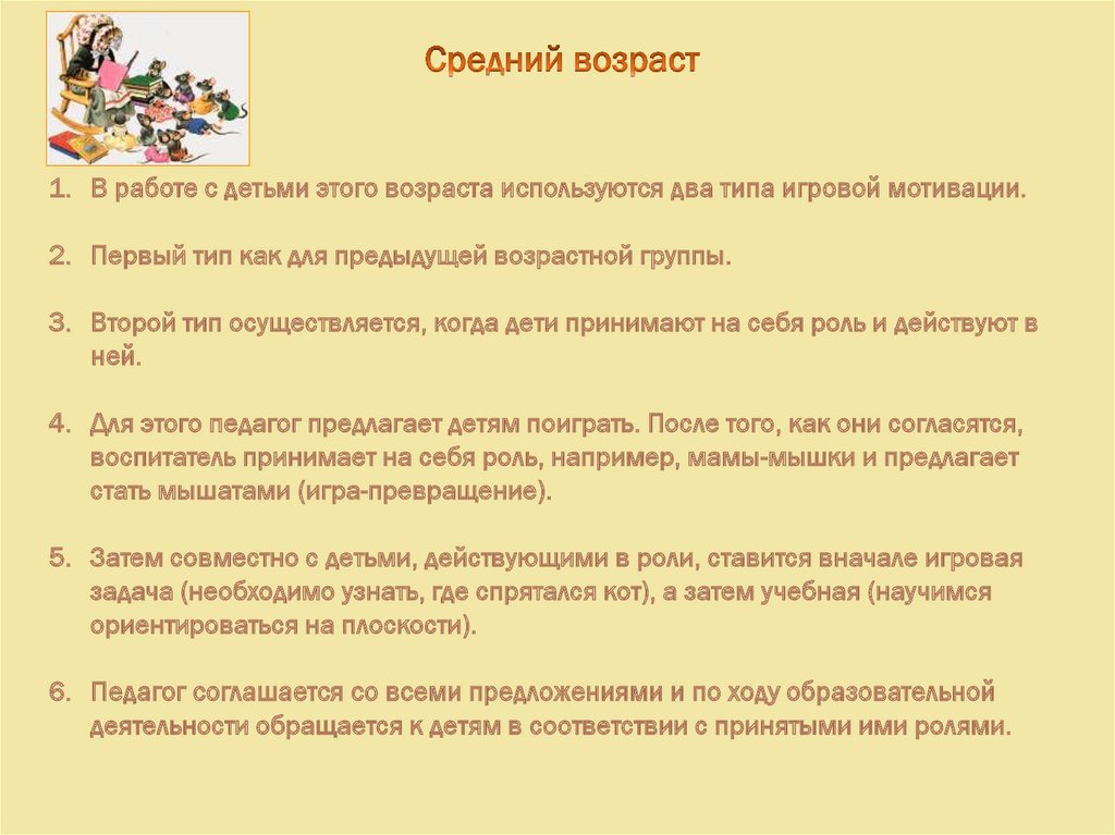 1. В работе с детьми этого возраста используются два типа игровой мотивации.2. Первый тип как для предыдущей возрастной группы.