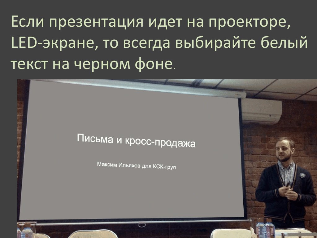 Если презентация идет на проекторе,LED-экране, то всегда выбирайте белый