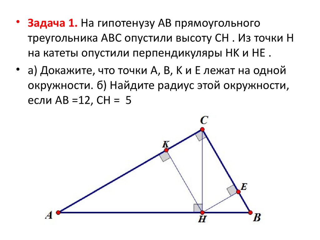 • Задача 1. На гипотенузу AB прямоугольноготреугольника ABC опустили высоту CH . Из точки H