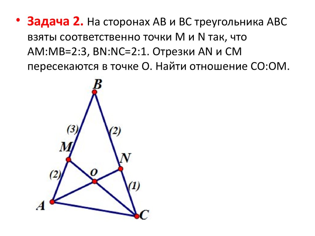 • Задача 2. На сторонах AB и BC треугольника ABCвзяты соответственно точки M и N так, что