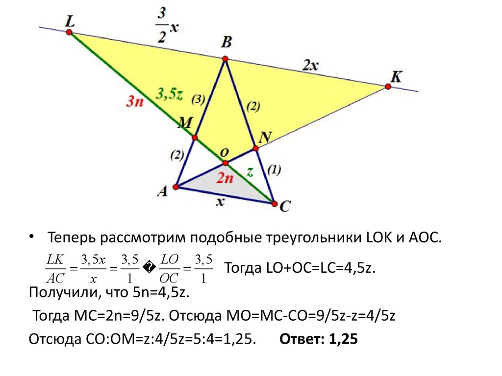 • Теперь рассмотрим подобные треугольники LOK и AOC.LK 3,5 x 3,5