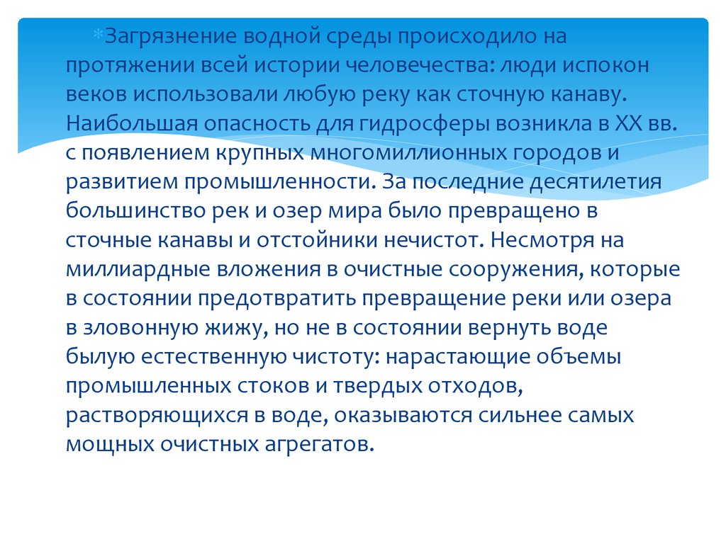 Наибольшая опасность для гидросферы возникла в XX вв.