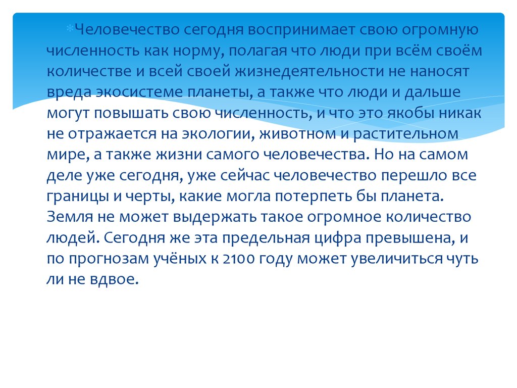 Человечество сегодня воспринимает свою огромнуючисленность как норму, полагая что люди при всём своём