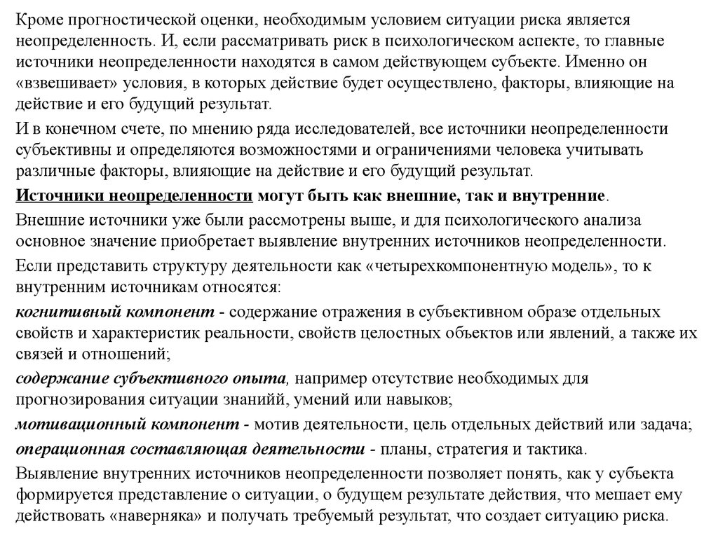 Кроме прогностической оценки, необходимым условием ситуации риска являетсянеопределенность. И, если рассматривать риск в психологическом аспекте, то главные