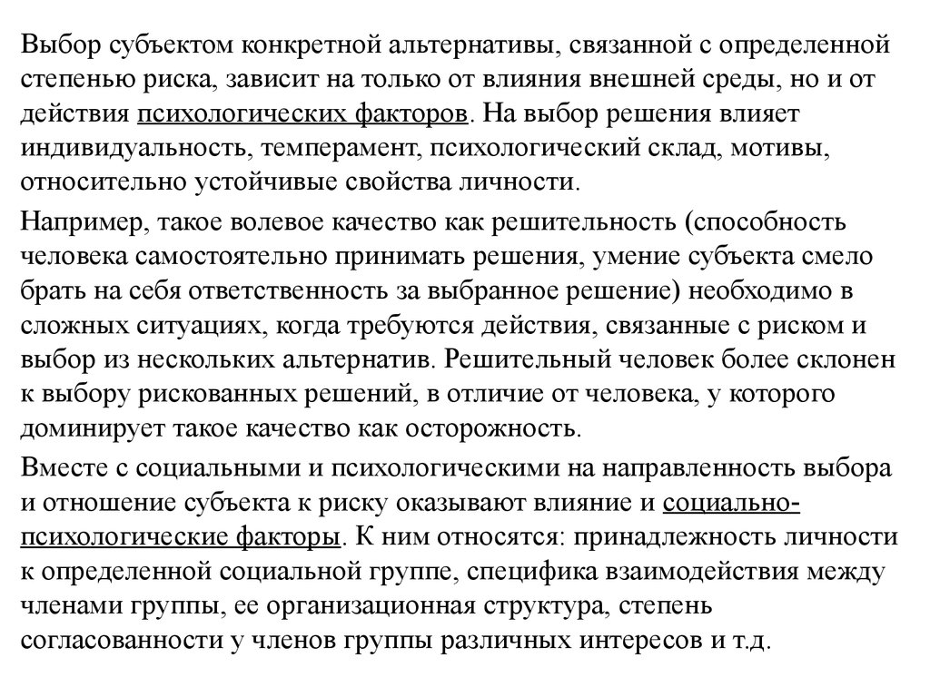 Выбор субъектом конкретной альтернативы, связанной с определеннойстепенью риска, зависит на только от влияния внешней среды, но и от