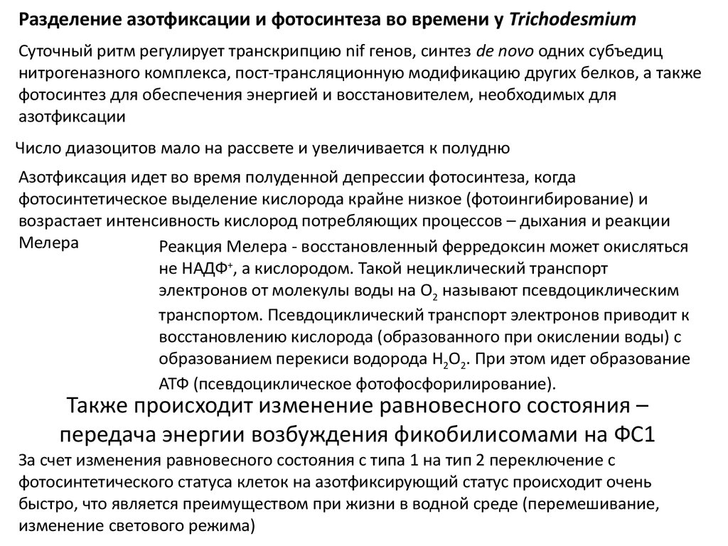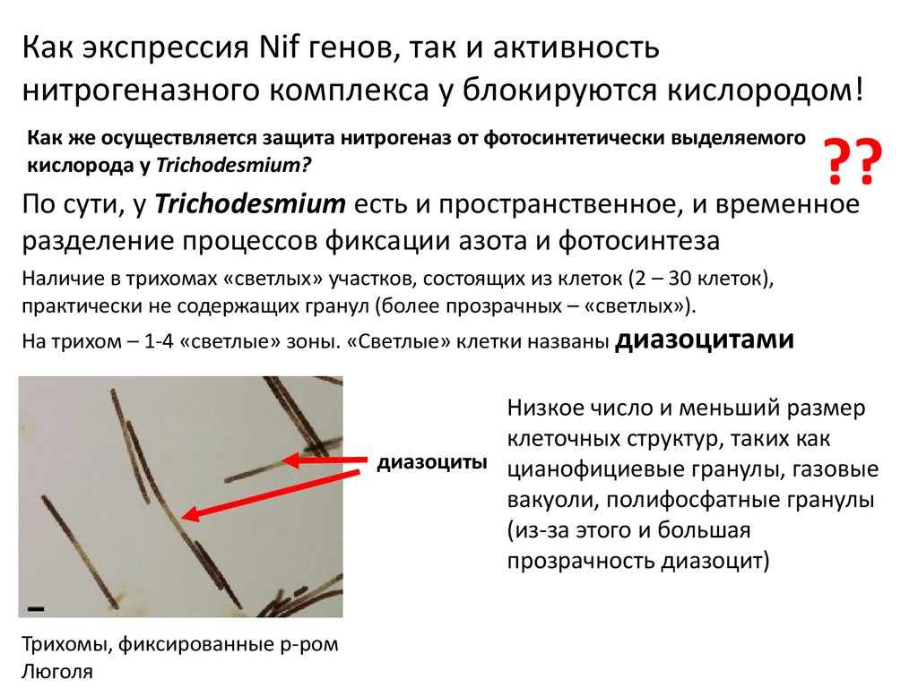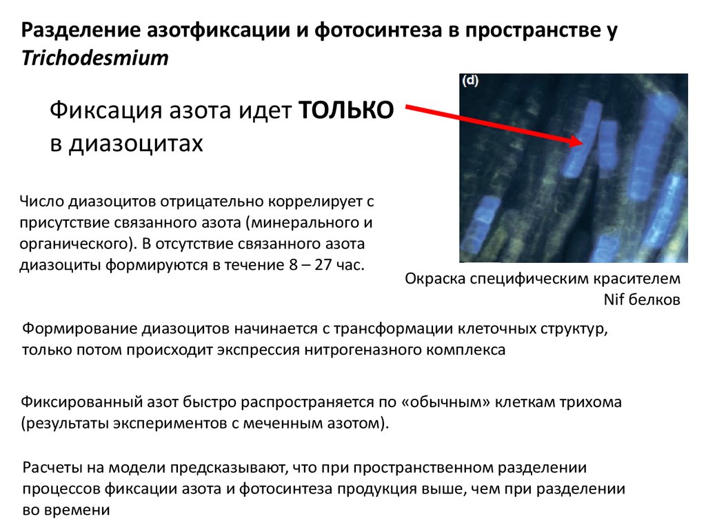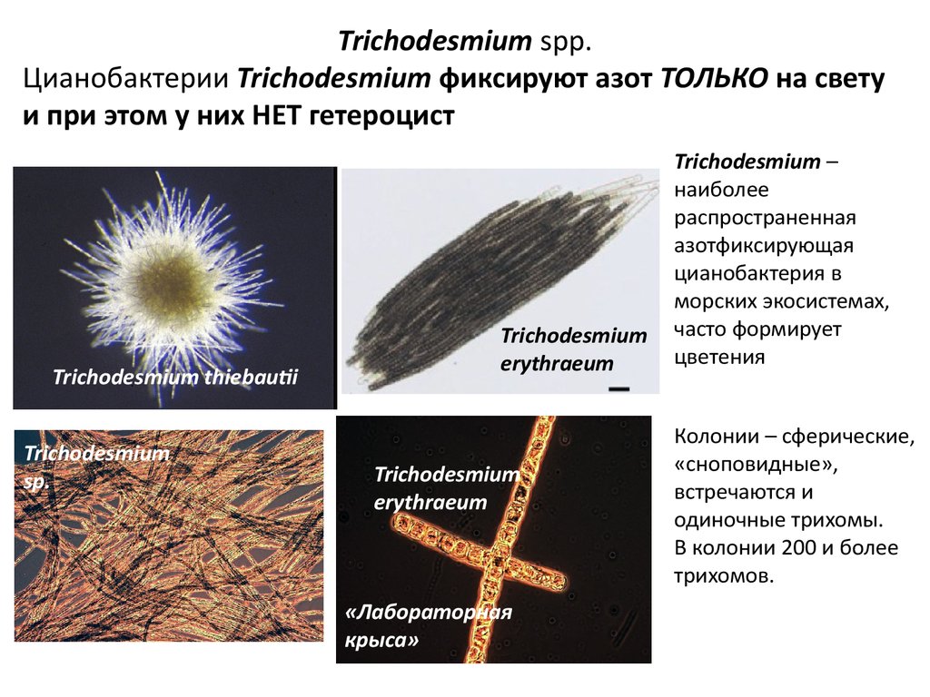 Trichodesmium spp.Цианобактерии Trichodesmium фиксируют азот ТОЛЬКО на свету
