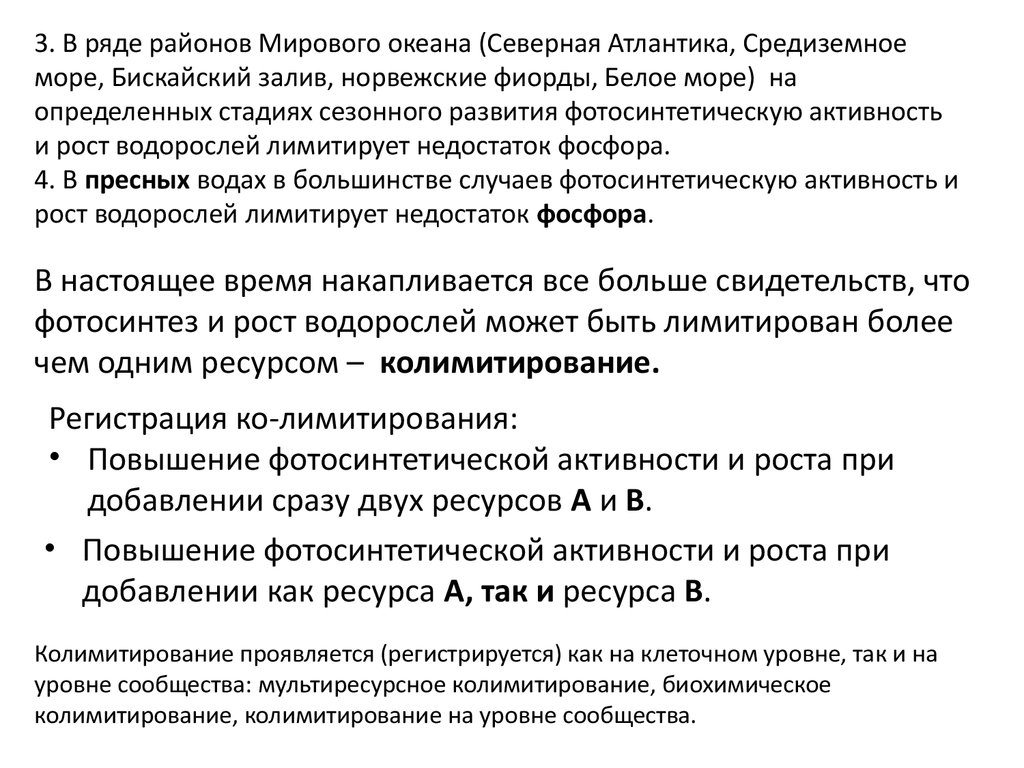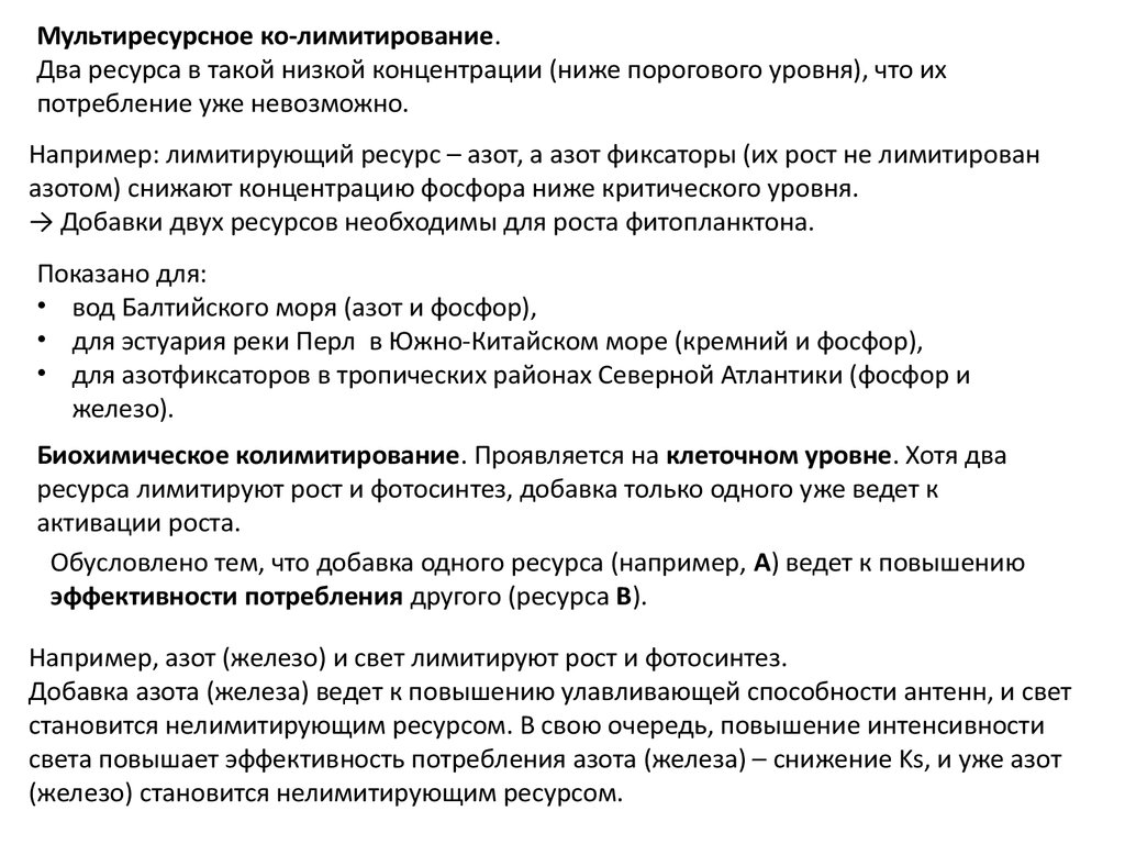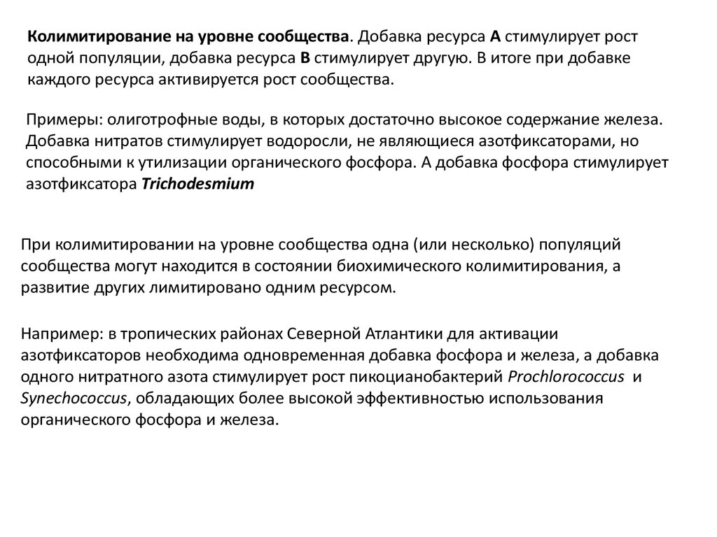 уровне сообщества: мультиресурсное колимитирование, биохимическое