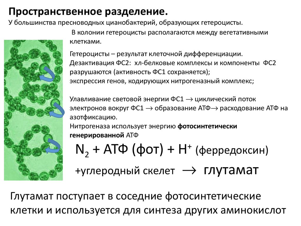 Пространственное разделение.У большинства пресноводных цианобактерий, образующих гетероцисты.