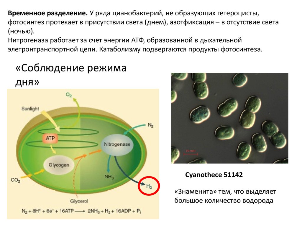 Временное разделение. У ряда цианобактерий, не образующих гетероцисты,фотосинтез протекает в присутствии света (днем), азотфиксация – в отсутствие света