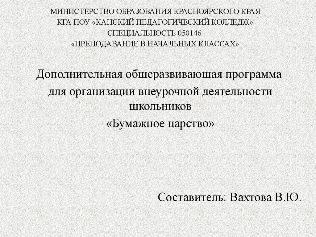 1. МИНИСТЕРСТВО ОБРАЗОВАНИЯ КРАСНОЯРСКОГО КРАЯ КГА ПОУ «КАНСКИЙ ПЕДАГОГИЧЕСКИЙ КОЛЛЕДЖ» СПЕЦИАЛЬНОСТЬ 050146 «ПРЕПОДАВАНИЕ В