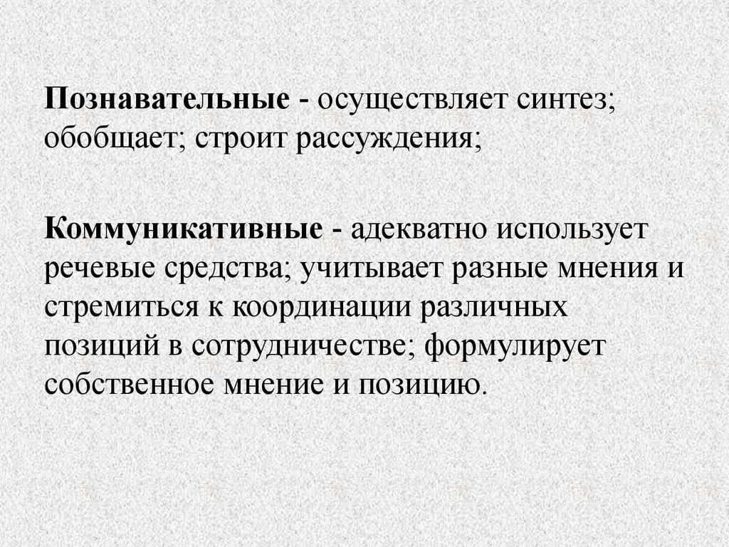 Познавательные - осуществляет синтез;обобщает; строит рассуждения;