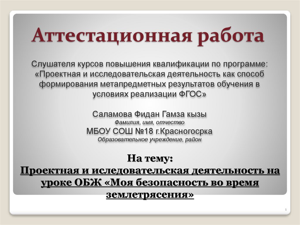 Аттестационная работа. Проектная и иследовательская деятельность на уроке ОБЖ «Моя безопасность во время землетрясения»