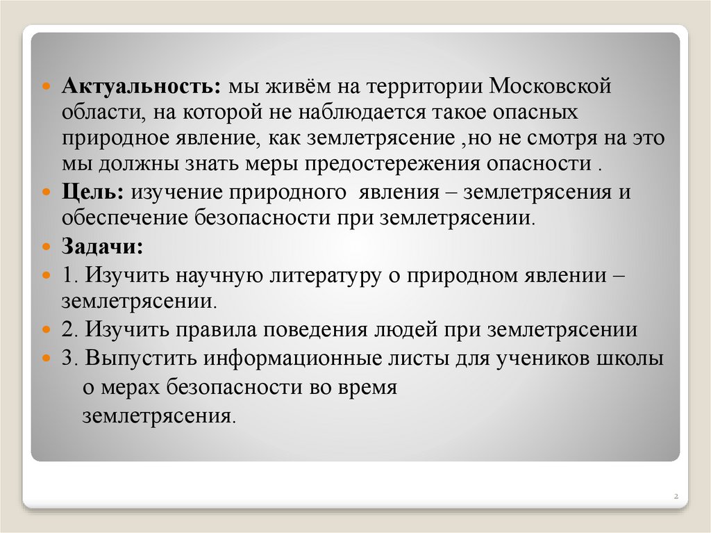 Актуальность: мы живём на территории Московскойобласти, на которой не наблюдается такое опасных