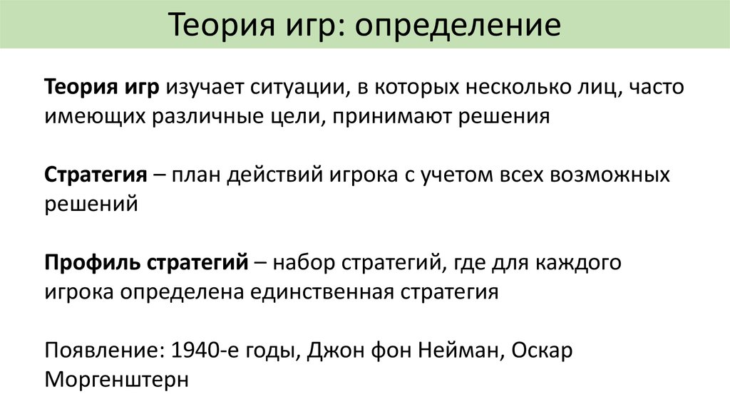Теория игр: определениеТеория игр изучает ситуации, в которых несколько лиц, часто