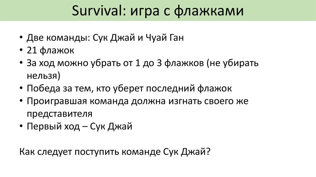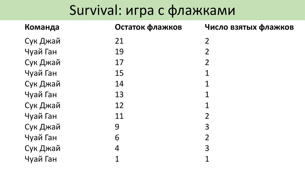 Survival: игра с флажками• Две команды: Сук Джай и Чуай Ган