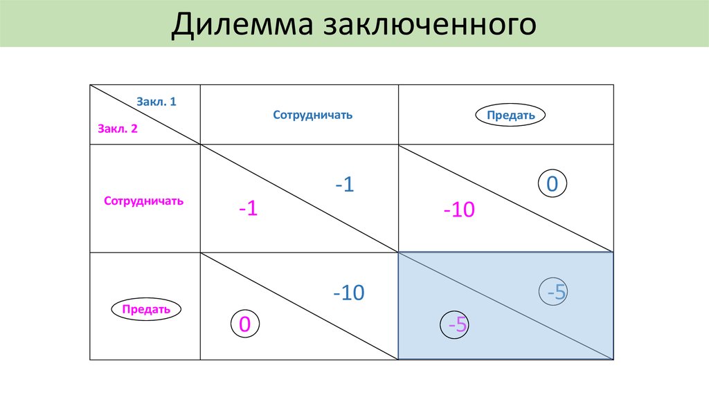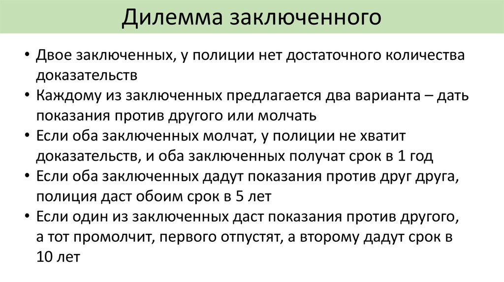 Дилемма заключенного• Двое заключенных, у полиции нет достаточного количества