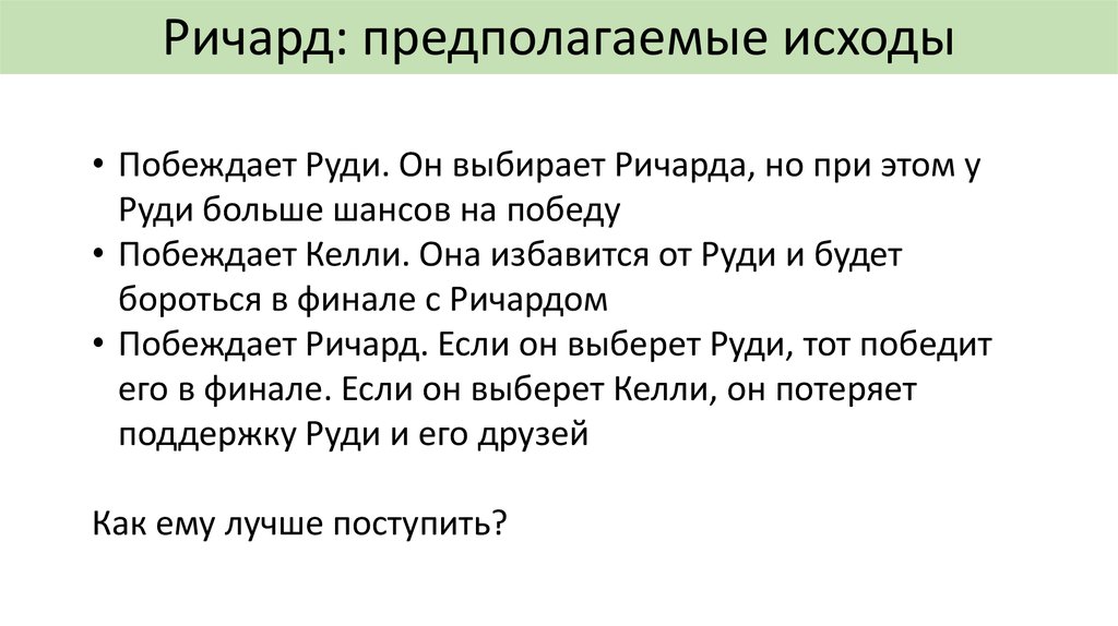 Ричард: предполагаемые исходы• Побеждает Руди. Он выбирает Ричарда, но при этом у