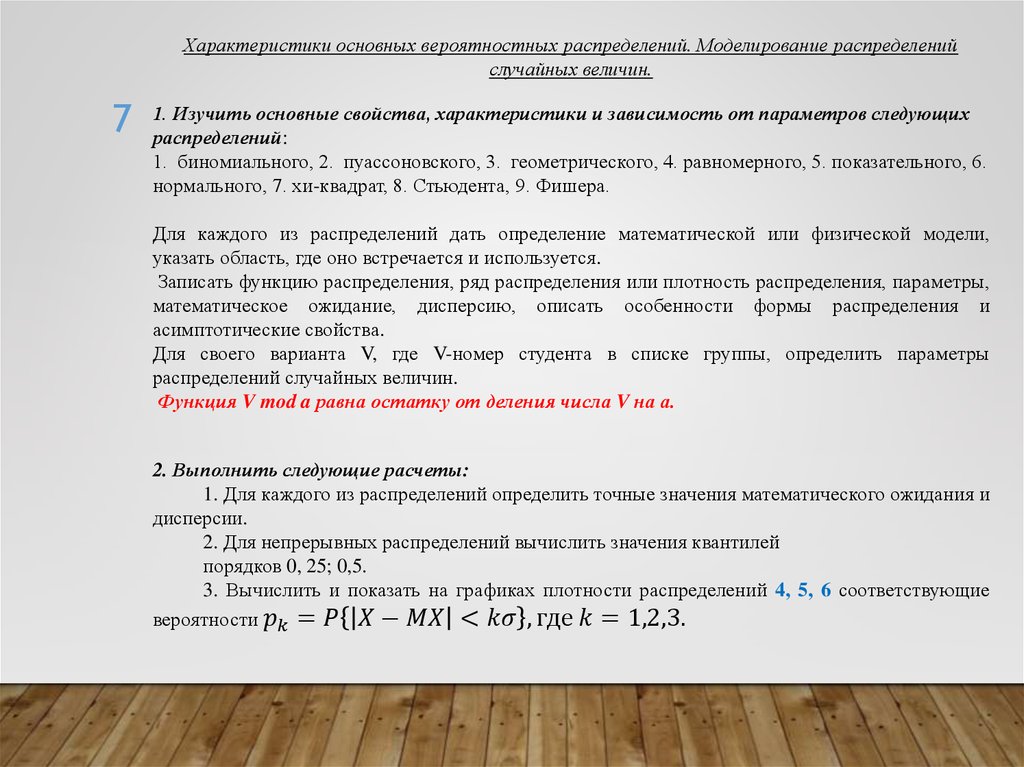 нормального, 7. хи-квадрат, 8. Стьюдента, 9. Фишера.
