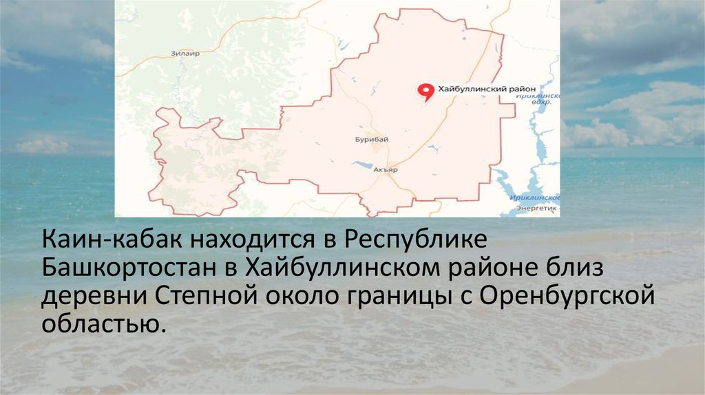 Каин-кабак находится в РеспубликеБашкортостан в Хайбуллинском районе близ