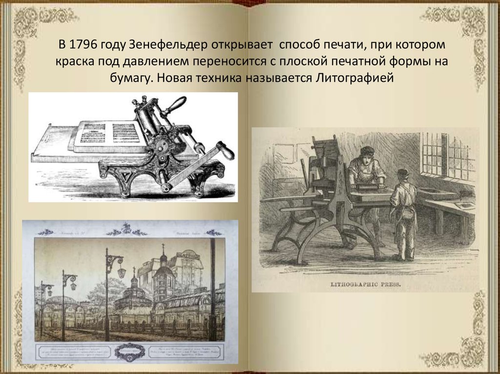 В 1796 году Зенефельдер открывает способ печати, при которомкраска под давлением переносится с плоской печатной формы на