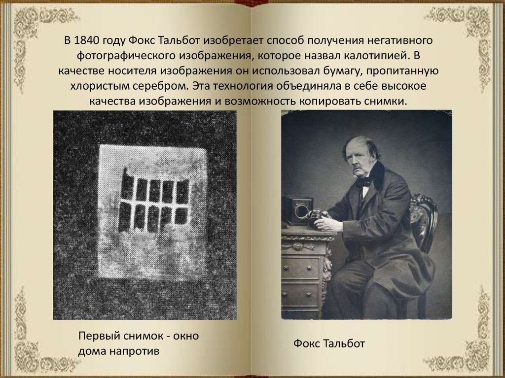 В 1840 году Фокс Тальбот изобретает способ получения негативногофотографического изображения, которое назвал калотипией. В