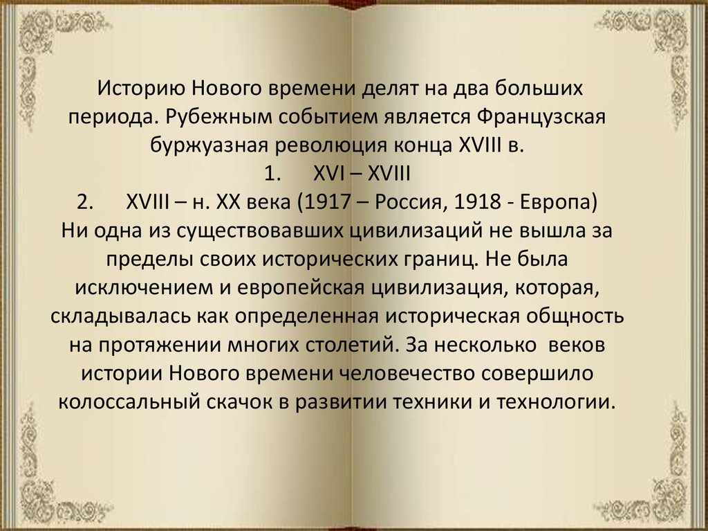 Историю Нового времени делят на два большихпериода. Рубежным событием является Французская