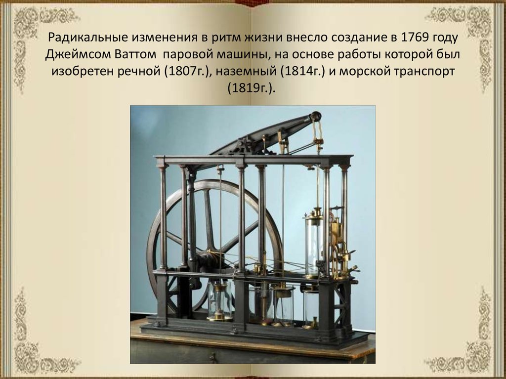 Радикальные изменения в ритм жизни внесло создание в 1769 годуДжеймсом Ваттом паровой машины, на основе работы которой был