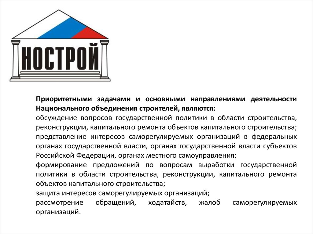 Приоритетными задачами и основными направлениями деятельностиНационального объединения строителей, являются: