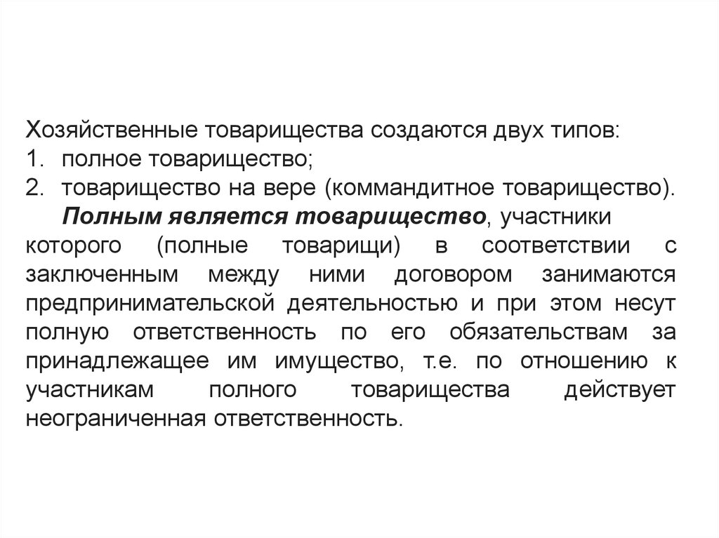 Хозяйственные товарищества создаются двух типов:1. полное товарищество;