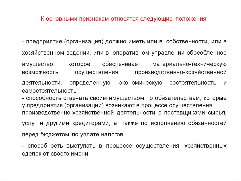 К основными признакам относятся следующие положения:- предприятие (организация) должно иметь или в собственности, или в