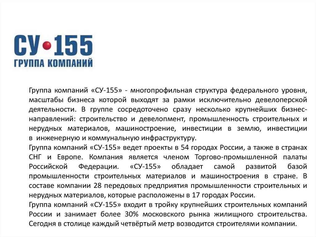 Группа компаний «СУ-155» - многопрофильная структура федерального уровня,масштабы бизнеса которой выходят за рамки исключительно девелоперской