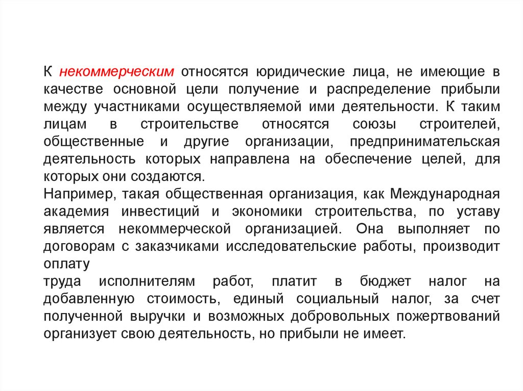 К некоммерческим относятся юридические лица, не имеющие вкачестве основной цели получение и распределение прибыли